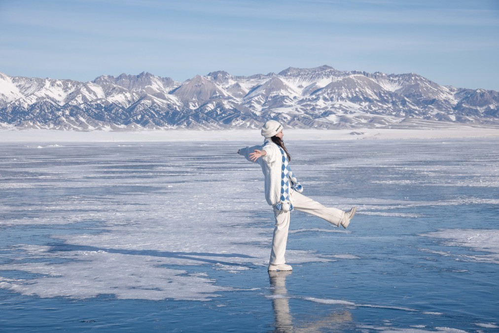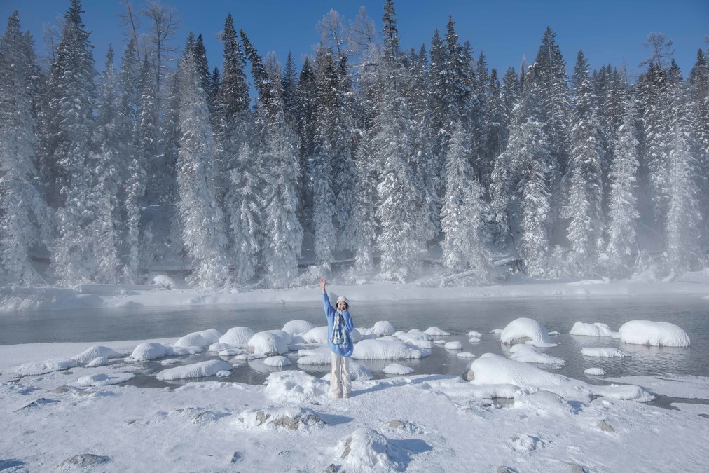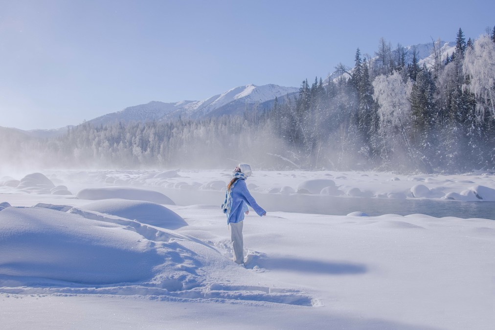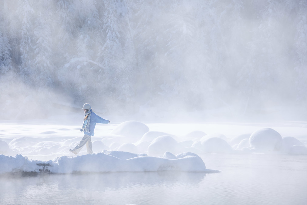 What kind of impression does the northern part of the country have during winter? It's the extremely cold weather of minus thirty degrees Celsius, shivering with thick down jackets on the vast and deserted land, with frost covering one's head. It's also the pointed-roofed houses of Hemed Village covered in snow, the curling mist on the unfrozen lake of Kanas, the blue ice bubbles on the Seryum Lake, the frost and white swans at the Swan Spring in Yining, and the long and wide powder snow slopes of General Mountain.