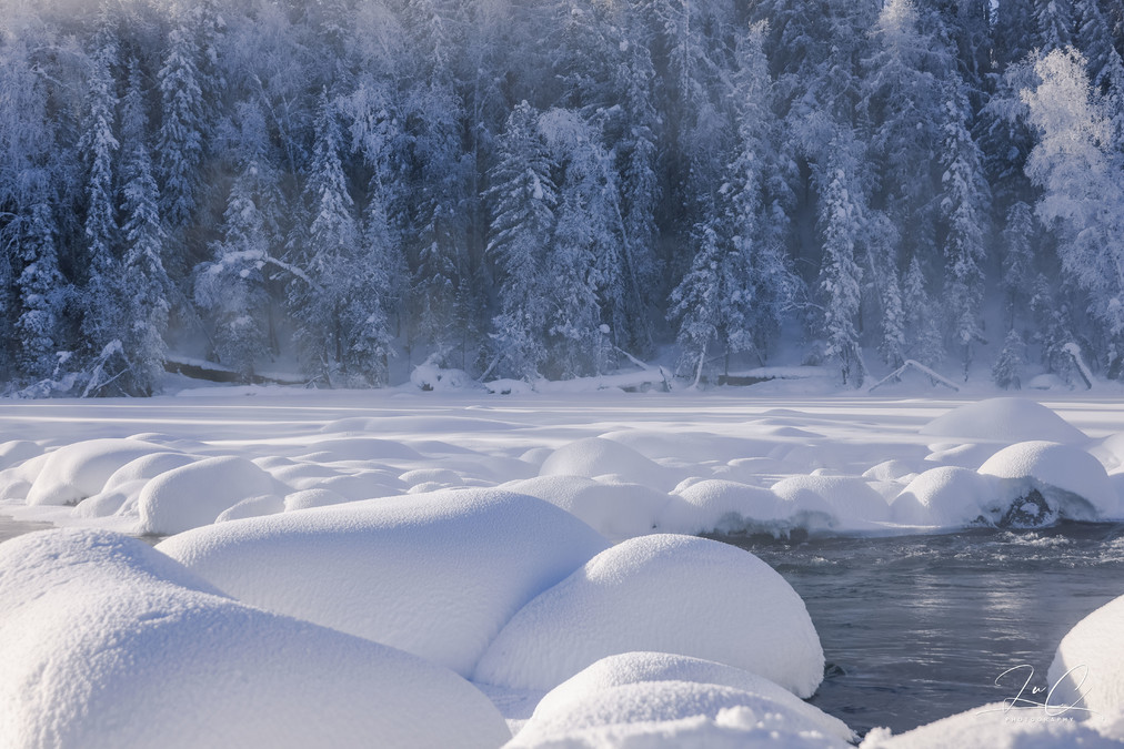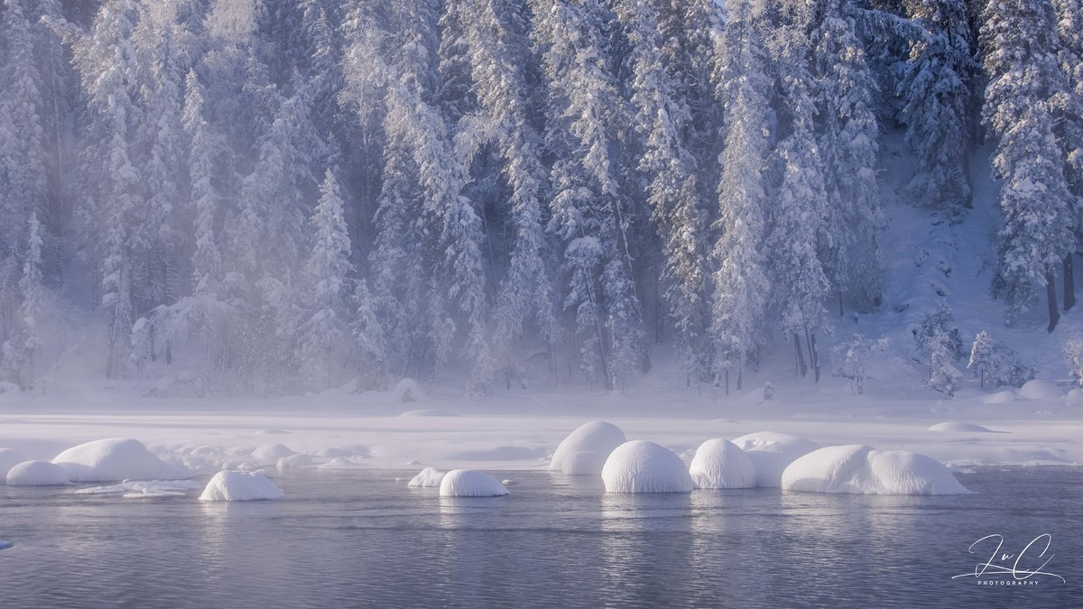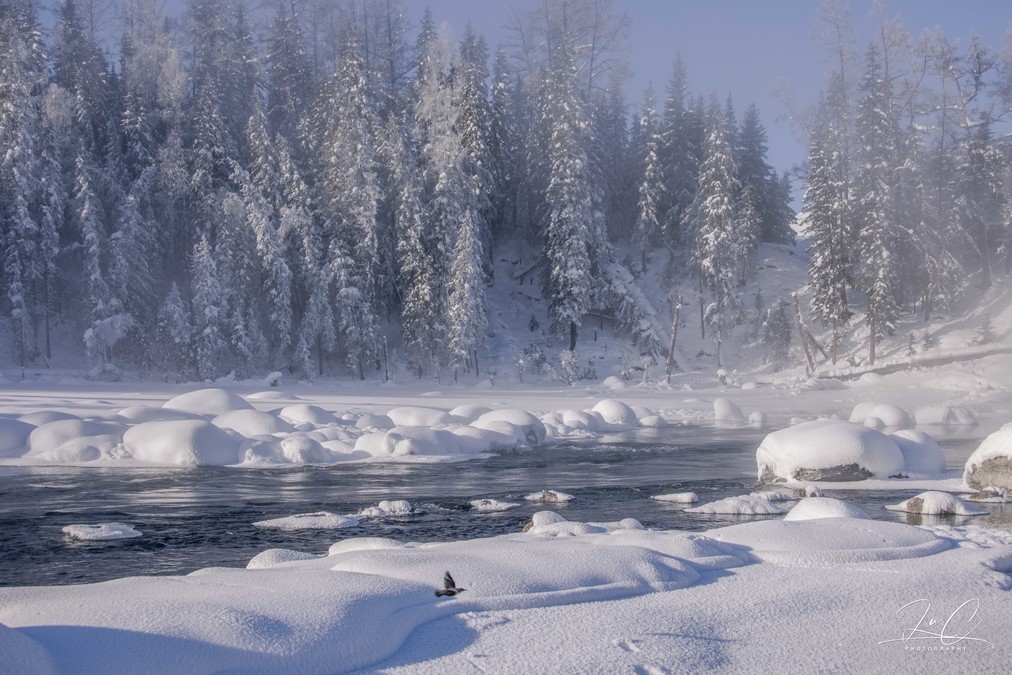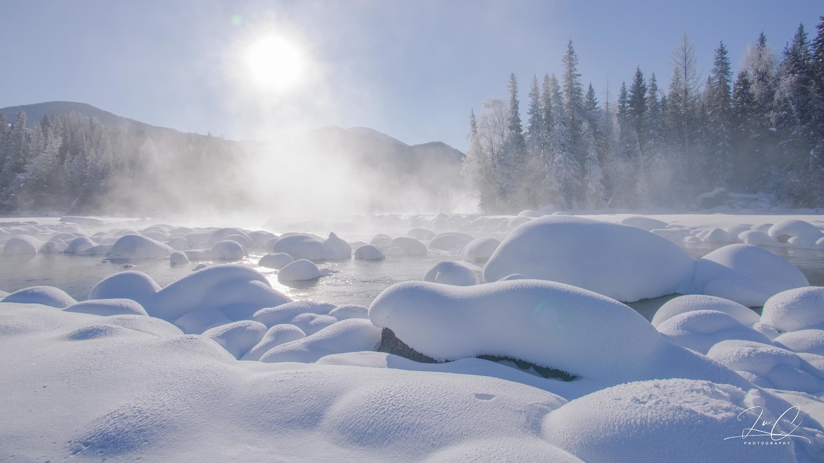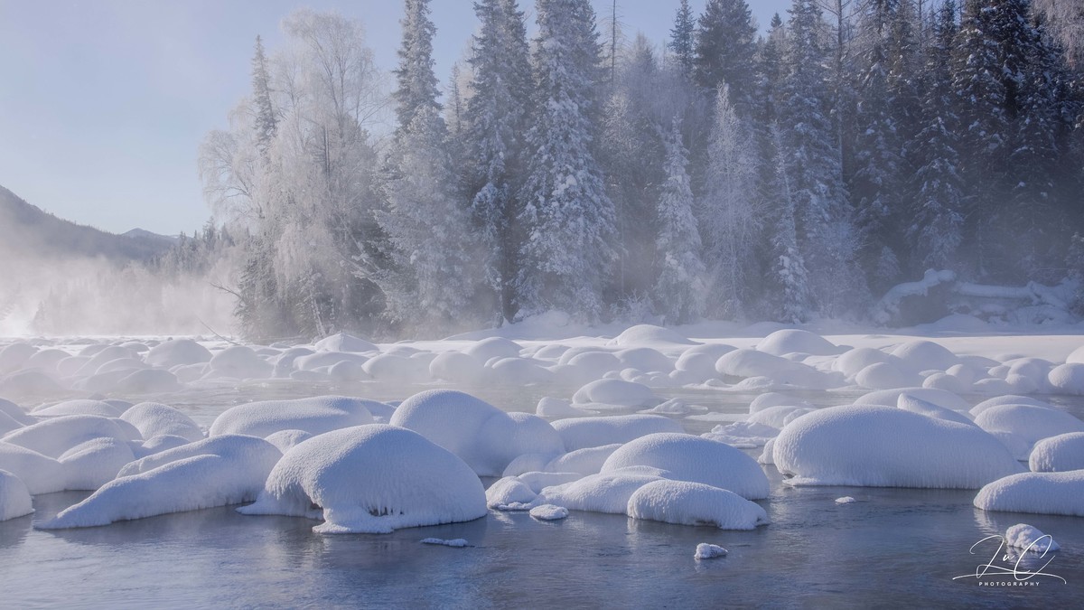 At 11:30, we arrived at the shore of Kanas Lake. Although the sun had risen, it was still a fairyland here! The persistent fog lingering on the unfrozen river, the frozen forest in the distance, and the "snow dumplings" piled up on the river all made my entire heart want to be submerged in this scene. I frantically pressed the shutter!