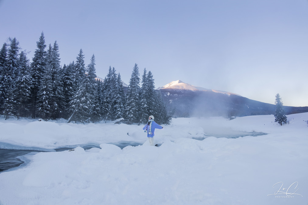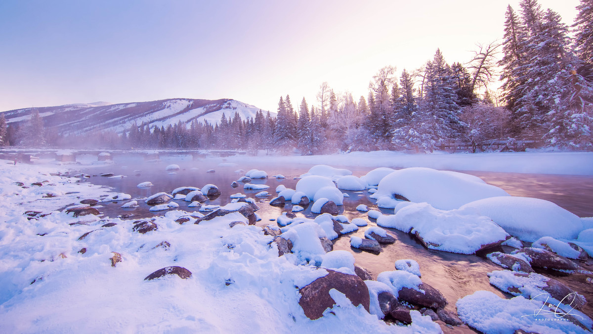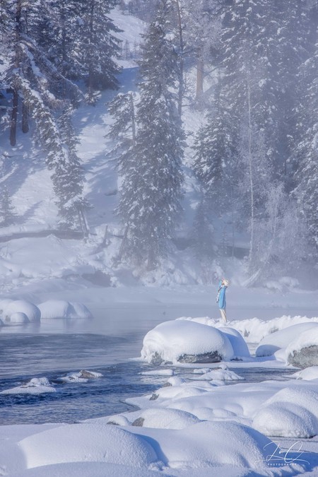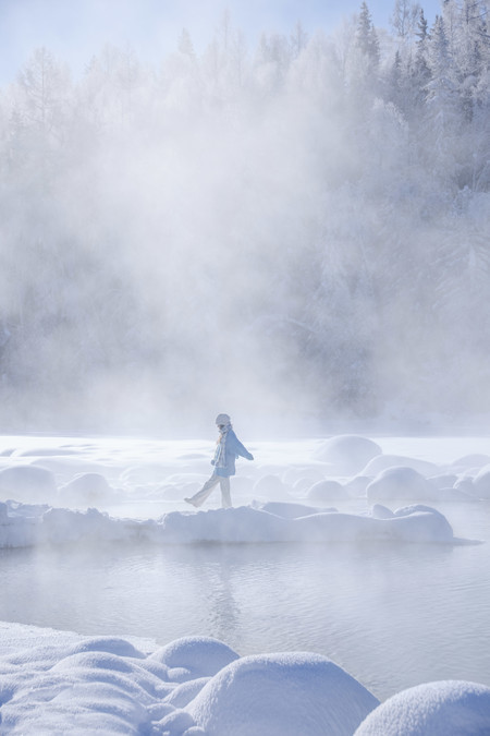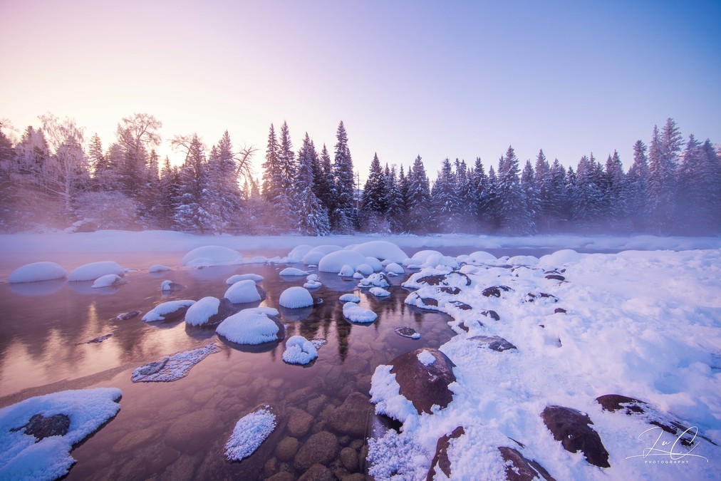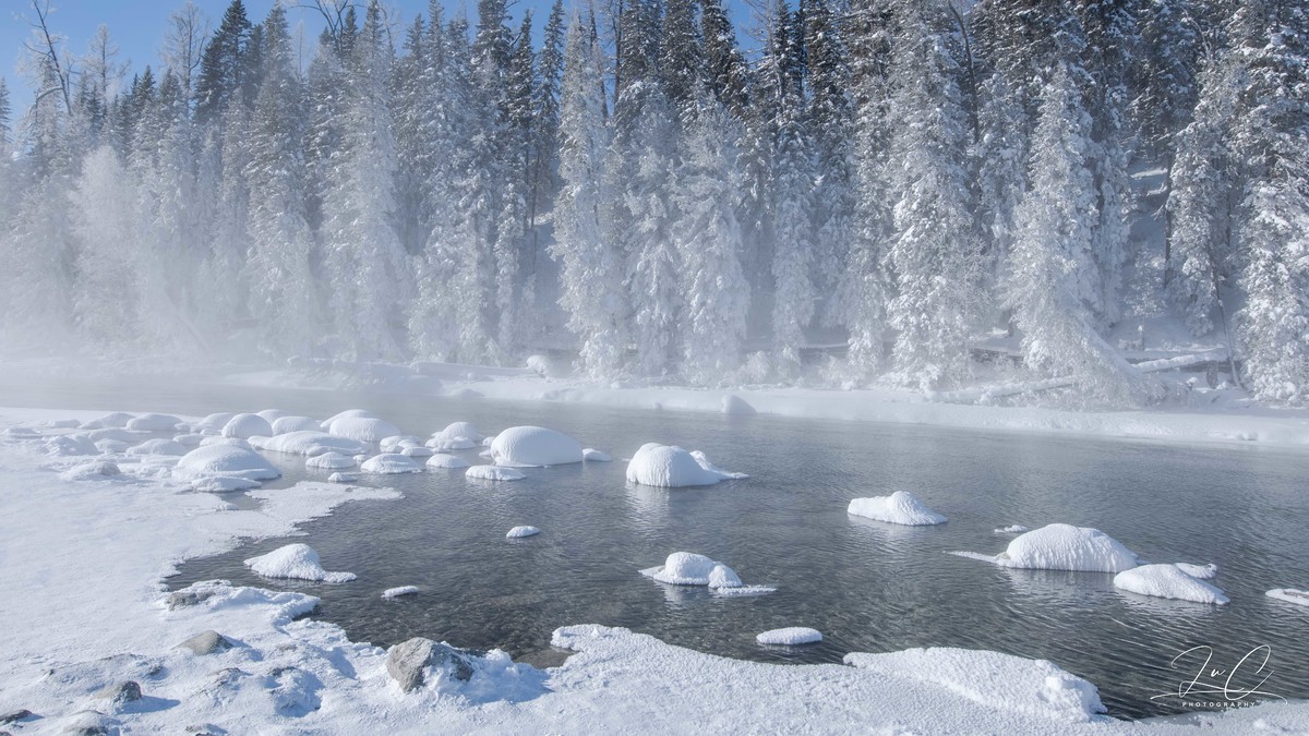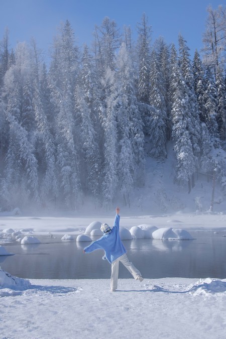 At 11:30, we arrived at the shore of Kanas Lake. Although the sun had risen, it was still a fairyland here! The persistent fog lingering on the unfrozen river, the frozen forest in the distance, and the "snow dumplings" piled up on the river all made my entire heart want to be submerged in this scene. I frantically pressed the shutter!