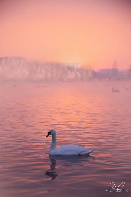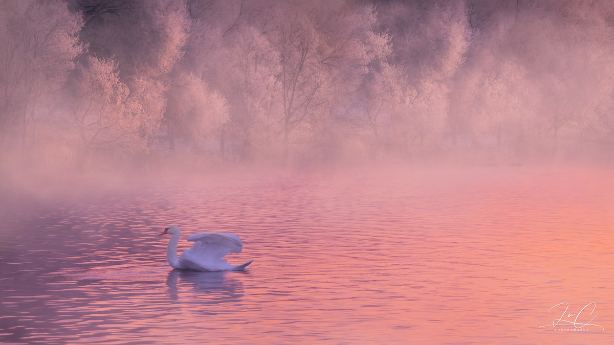 On the day we arrived, we were very fortunate to witness the morning glow! The entire sky and the lake surface were dyed pink, creating a particularly dreamlike scene! When we arrived in the morning, the sky was still dark and the swans were all huddled with their necks tucked in, sleeping. As the sky gradually brightened, the swans gradually woke up and began to swim slowly in the lake or groom their feathers. There was an old hermit who taught me this: when observing that a swan is taking a bath, it's time to prepare because they usually flap their wings after bathing (sort of like dogs shaking off water), and taking a few photos in advance can capture the scene of the swan spreading its wings!