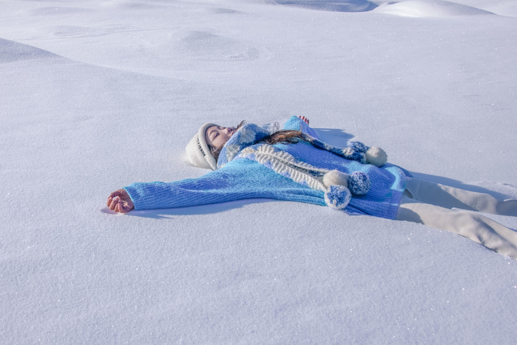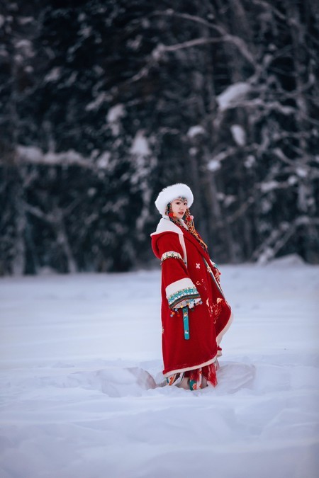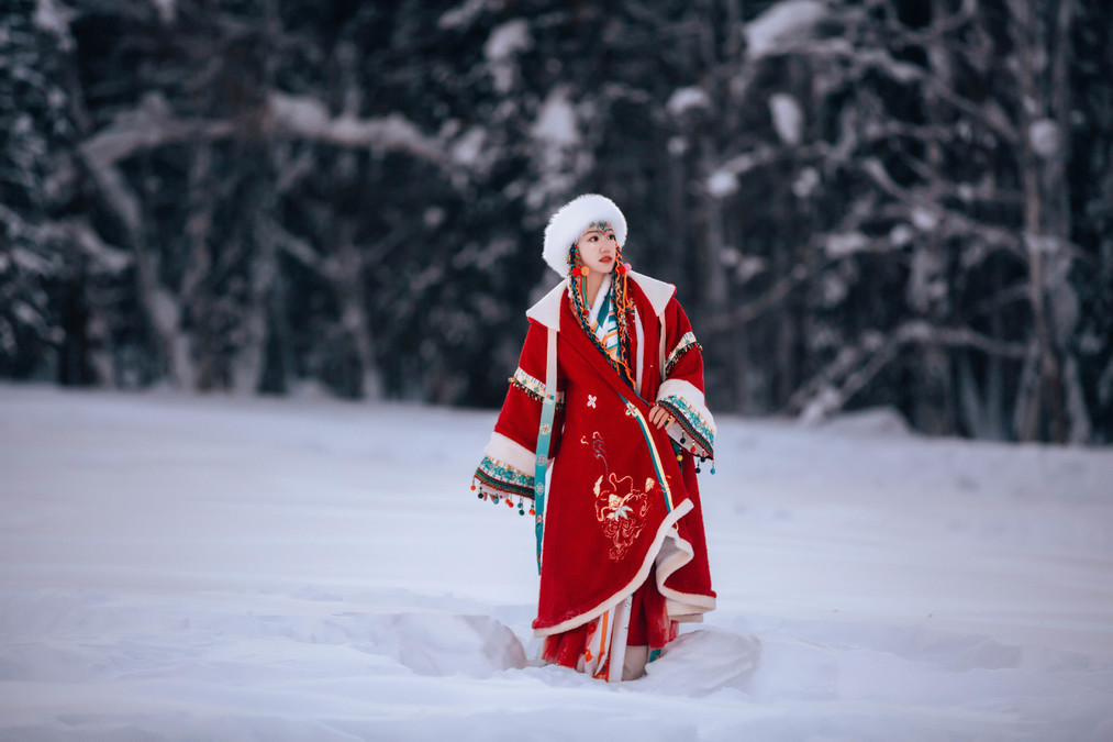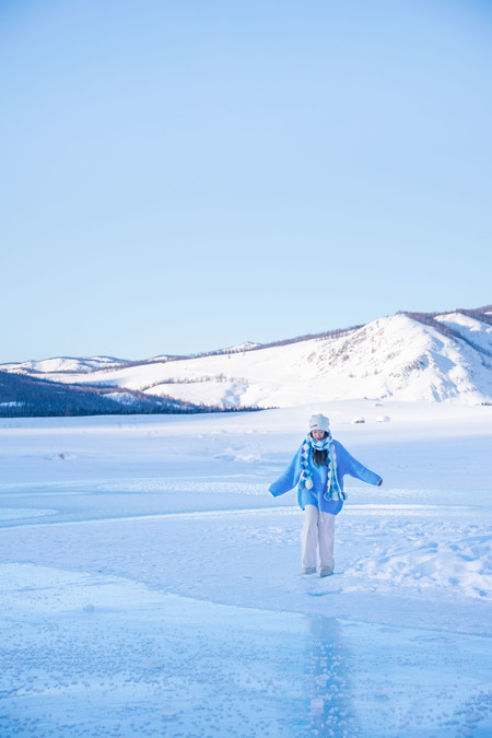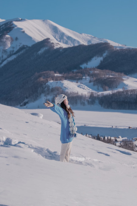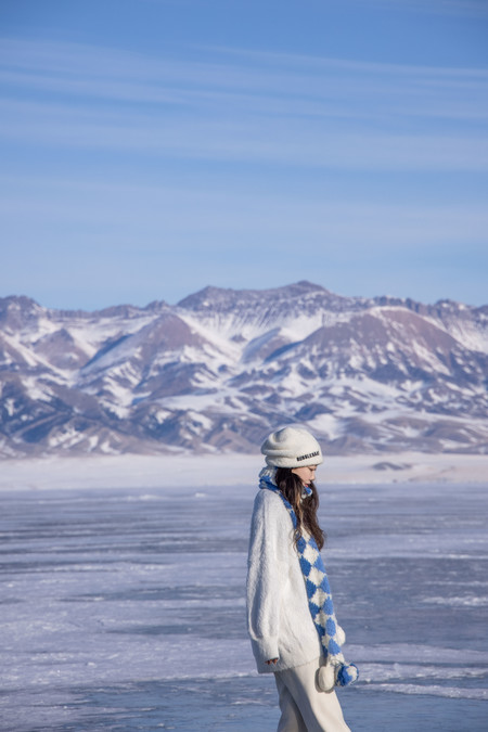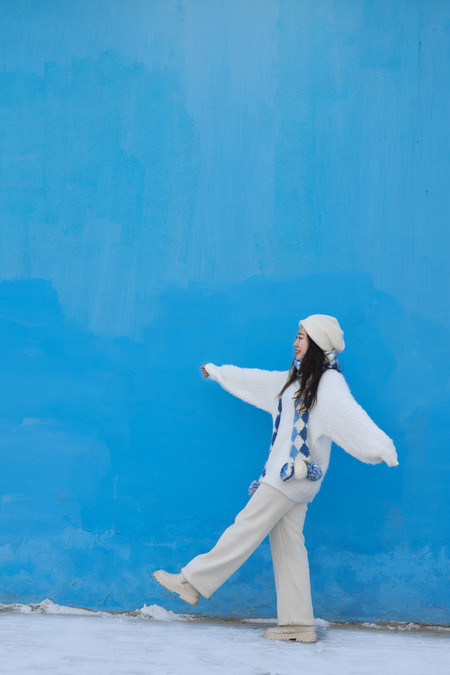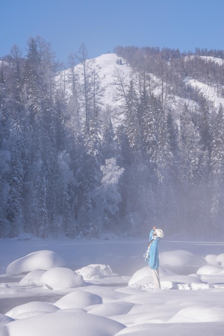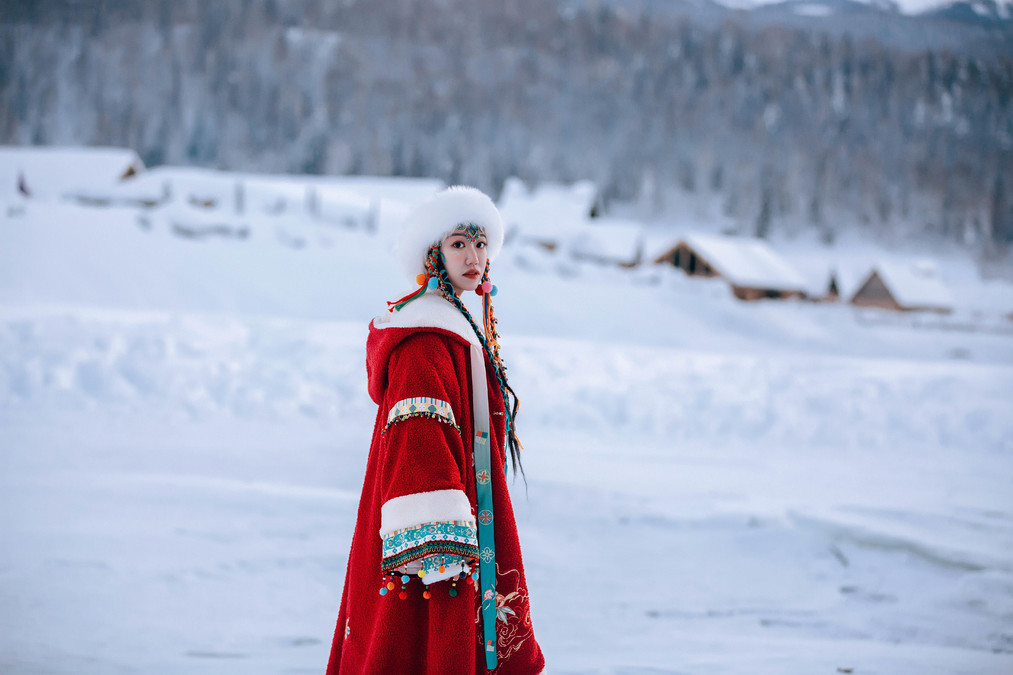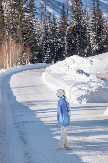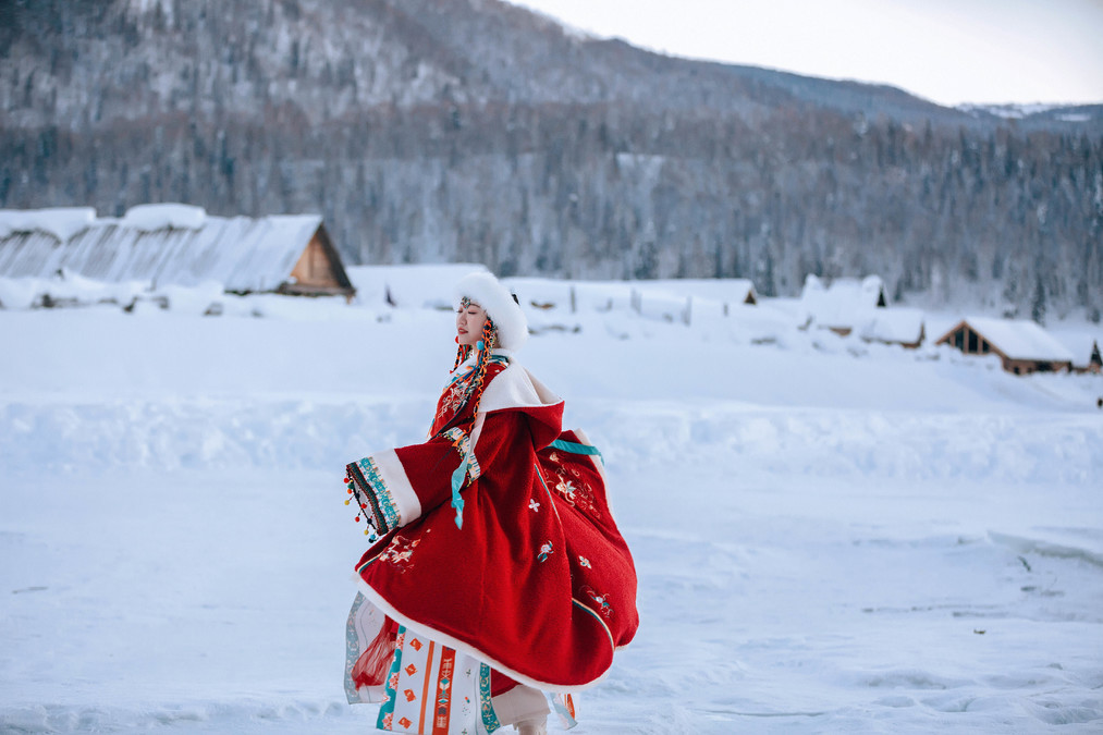 The clothes I wore for this trip were very simple. I wore a blue sweater, a white sweater, along with white pants, a white hat, and a blue and white woolen scarf throughout the entire journey. In the snowy northern region of winter, simple colors work very well. White and blue are complementary colors that blend seamlessly with the scene. The blue sweater pairs well with the snowy Hemo and Kanas areas, and the white sweater pairs well with the blue ice world of Selim Lake. When photographed, the entire scene looks very clean and natural. Our group wore the most red clothes. The red color's点缀in the snow is also very special. The day before, when I was shooting ethnic costumes, I chose a red one (but mainly because that set was the thickest and warmest), and I prefer a more light and fresh style for my own clothes.