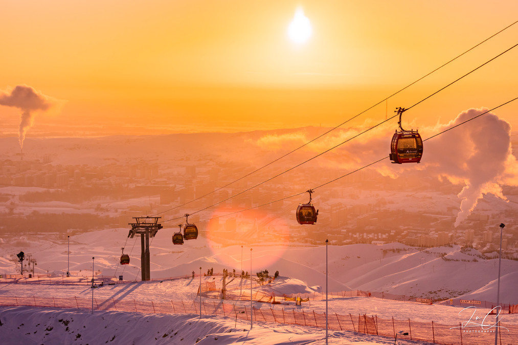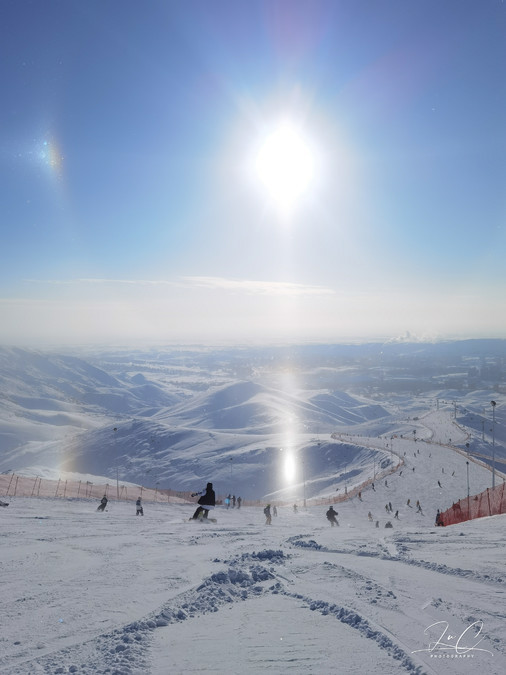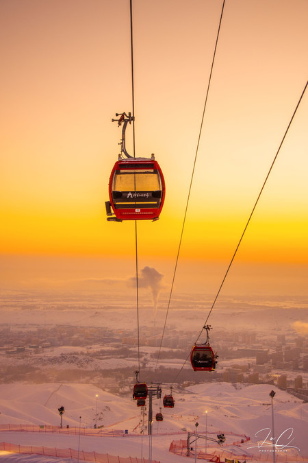 The best place to watch the sunset is at the top of the mountain. In the evening, the coffee house at the top of the mountain is crowded with people waiting to watch the sunset. When the daytime skiing session ends at sunset, the ski slopes will be temporarily closed for snow removal. After sunset, the night skiing session will start and the slopes will reopen. Many skiers choose to watch the sunset and then wait for the night session to start before skiing down. Those who don't ski down wait in line to take the cable car down the mountain. I went up the mountain with my camera and wondered if I had the ability to ski down with the camera, so I queued up for the cable car. I really regretted it because there were so many people and the queue was extremely long. I shivered and froze for over an hour before finally being able to get down the mountain.