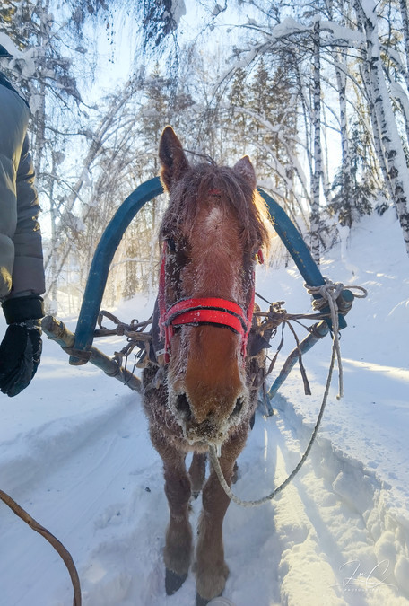 The viewing platform is not very high. It only takes 20 minutes to reach it by climbing the stairs. In winter, there is a horse-drawn sled project, where a horse pulls a sled. The sled can accommodate 2 to 3 people, allowing the horse to pull it up and down the viewing platform along the slope. The tour group arranged this activity for everyone, and I followed along, but after sitting in it, I regretted it. The snow on the slope was 1-2 meters thick. The path used by the local herders was narrow, especially the one cut out for the horses. When the up and down directions met, the horse-drawn carriage had to struggle through the 1-meter-deep snow (with the people getting off), and the snow was up to the horse's chest. The herders were whipping the horses to make them push forward in the snow. It made me feel extremely uncomfortable. Moreover, when people were sitting in the vehicle, their clothes would get wet with the snow, and the shoes and trouser cuffs were not tightly sealed, causing a lot of snow to enter. We encountered several "head-on encounters" on the way up the mountain. The time was wasted on the road, and by the time we reached the top platform, we had missed the best viewing time. It would have been better to climb up by ourselves.