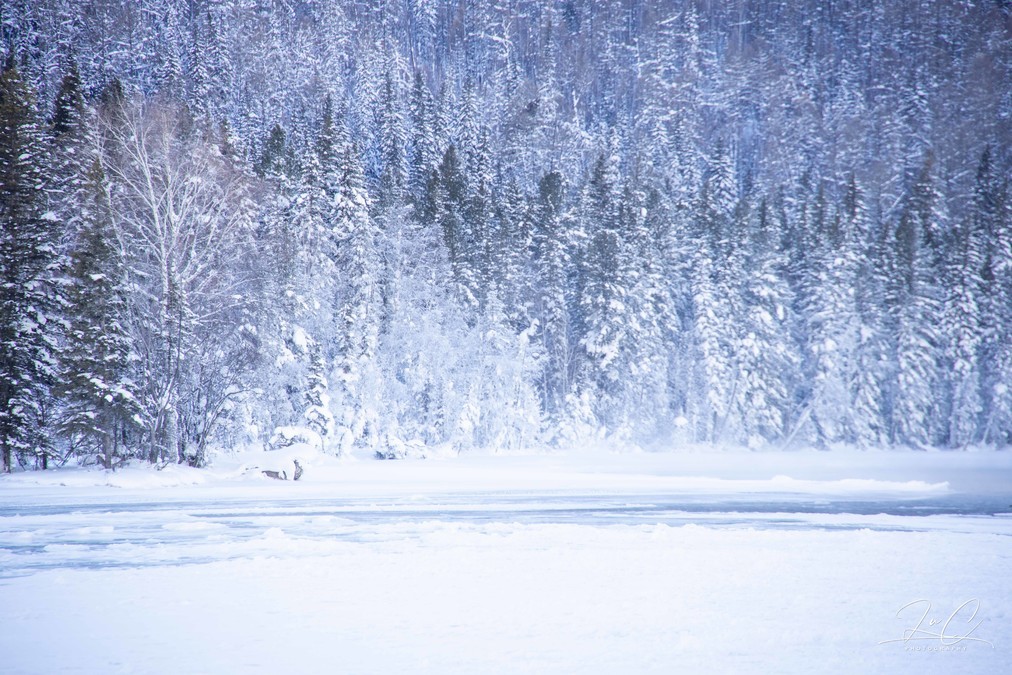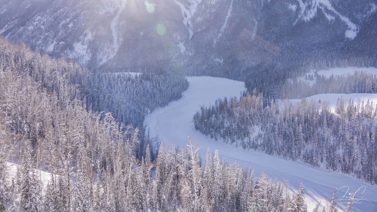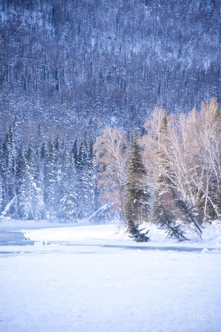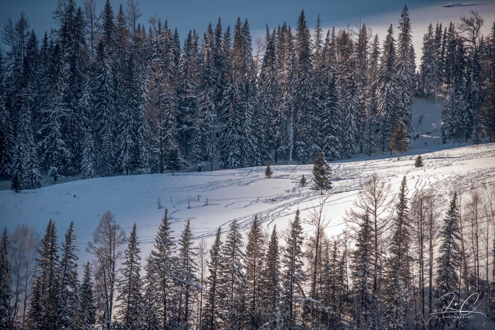 In winter, Kanas is covered with ice and snow. The large Kanas Lake does not freeze completely to form a non-freezing river along its entire perimeter, but the lower part of the Kanas River does freeze solid. Wolong Bay and Moon Bay are all covered with snow, making everything indistinguishable. Especially when we arrived at around four o'clock, it was the time with the poorest light conditions, and the direction was a strong backlight, which greatly reduced the beauty of the scene. When we came out at noon the next day, there was no backlight, but Moon Bay was unable to be parked in the direction out of the scenic area due to the slope, so we only took a quick glance from the car.
