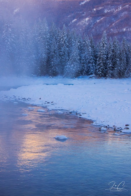 Perhaps it was because of the mountains and forests blocking the view that it wasn't until nearly 10 o'clock that the sun came out and the riverbank scenery was finally illuminated. The scenery by the river was truly breathtaking. The gentle morning mist, the icicles, the flowing water cascading through the snowfield - every breath was icy cold. The condensation from my breath froze my hair into a white mess, but I still wanted to embrace this scene with all my might.