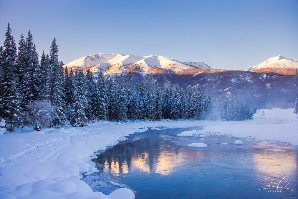 Right beside the village is the Kanas River. It's very close to the lake. The area where the river doesn't freeze is a bit larger. The local driver who brought us here said there would be fog in the morning, but it would clear up by midday. So I and a few of my fellow tourists who were fond of taking photos started walking to the river early in the morning before dawn to capture the morning mist. But later it turned out that this wave of fog hardly cleared up for the entire day.