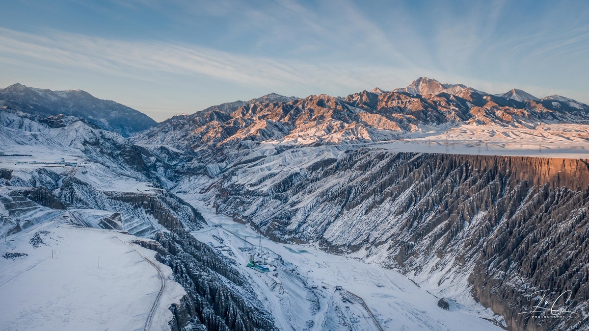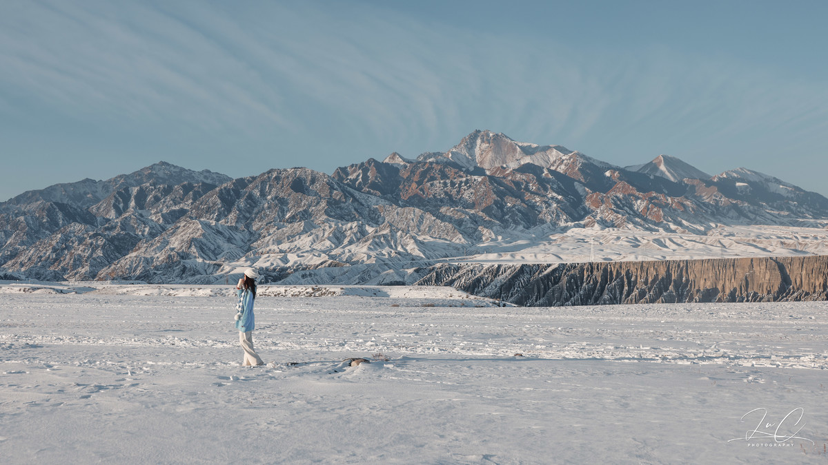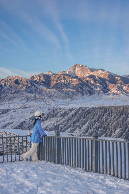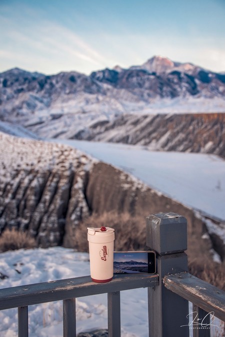 Dushanzi Grand Canyon obviously doesn't have the same high popularity as Kanas and Sai Lake. Few people travel a long distance just to visit it. But once you see it, it's definitely worth it. Although the river freezes over in winter and the land is covered with snow, it still retains its magnificent气势. We stayed in Kuitun last night and set off to watch the sunrise before dawn. On a sunny day, we were able to witness the entire process of the canyon being gradually illuminated by the sunlight.