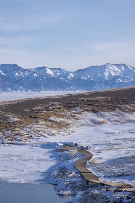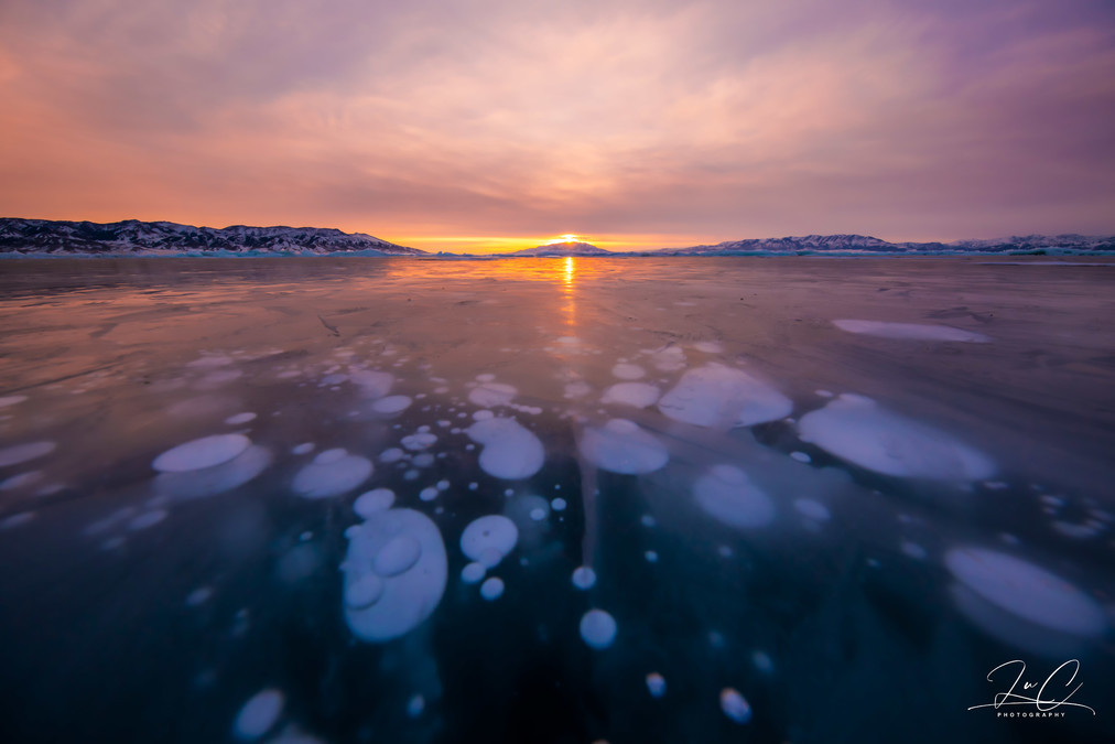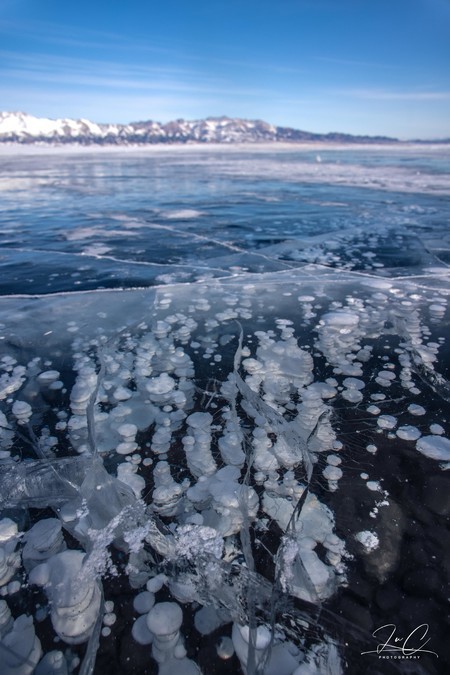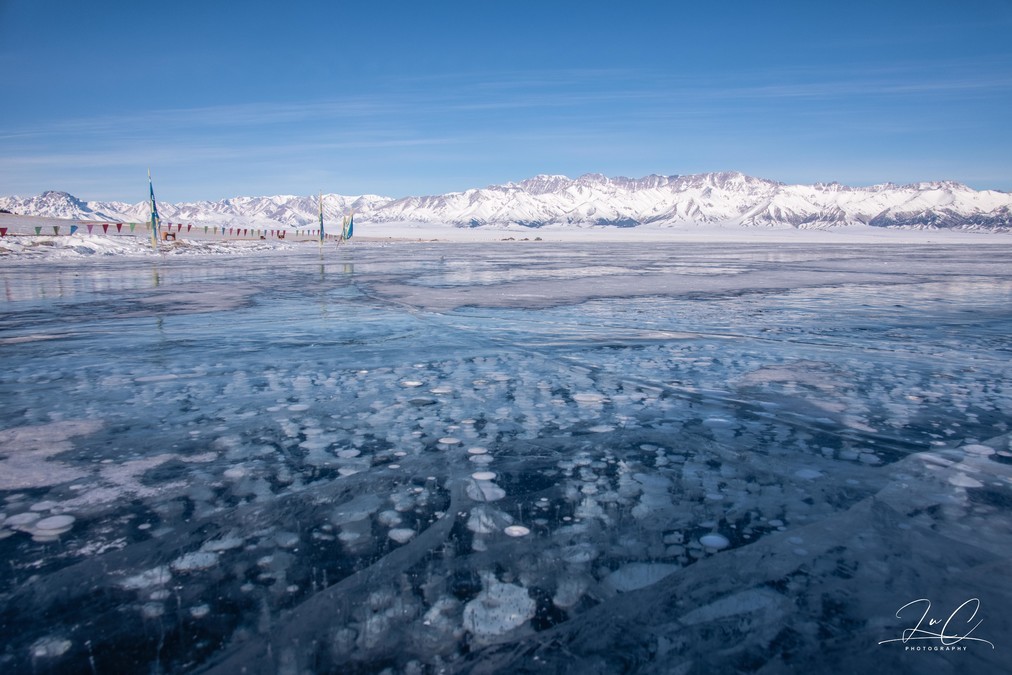 We stopped the car and walked along the wooden walkway to the lake. The biggest surprise we found was that there was a particularly clear and beautiful ice bubble here, much more beautiful than the one we saw in the morning. The ice bubbles were very dense, and under the sunlight, they faintly emitted rainbow-colored spots. It was simply breathtaking! Although there are also beautiful ice bubbles in the winter lakes in the suburbs of Beijing, there are no snow mountains in the distance! So we were very happy to take many photos here.