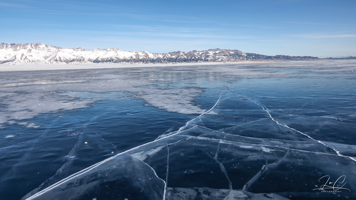 The next morning, even though it was still dark, we set off. Today's route was to enter through the east gate, circle the lake counterclockwise for sightseeing, and then exit through the south gate to reach Yining. The direction of the east gate was not suitable for watching the sunrise. So we drove to the position of General's Hill on the west side of the lake to watch the sunrise. Here, there was also a patch of blue ice that had not been covered by snow, and there were many ice bubbles, but they were not very clear.