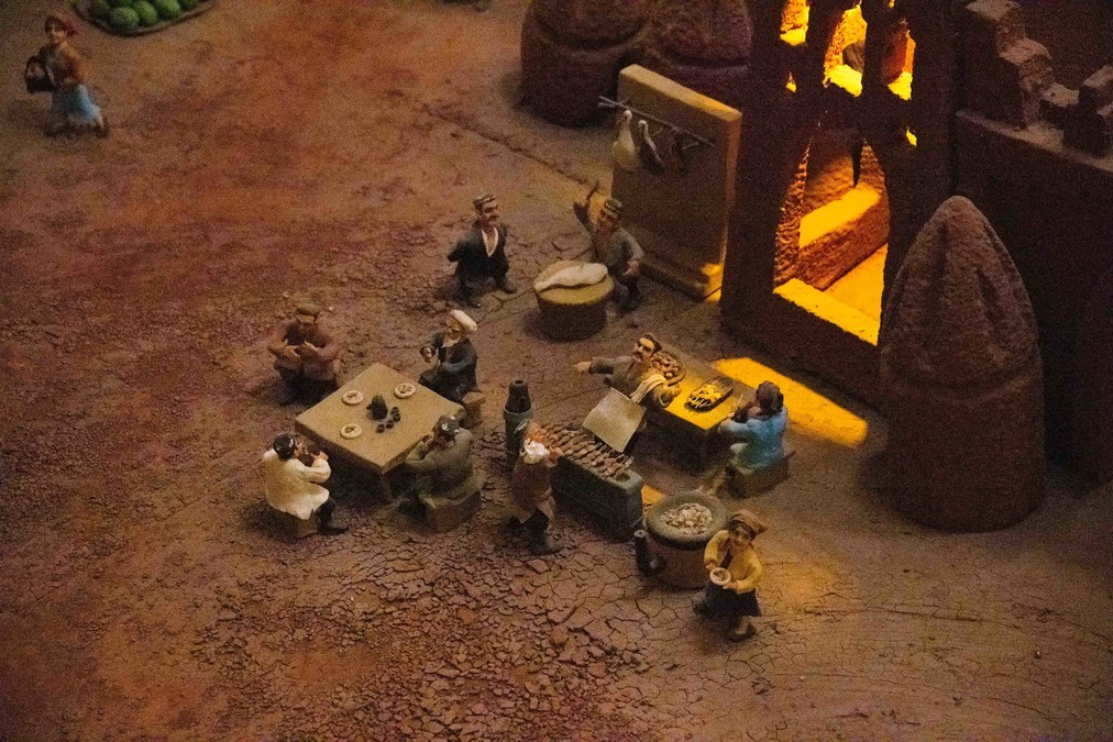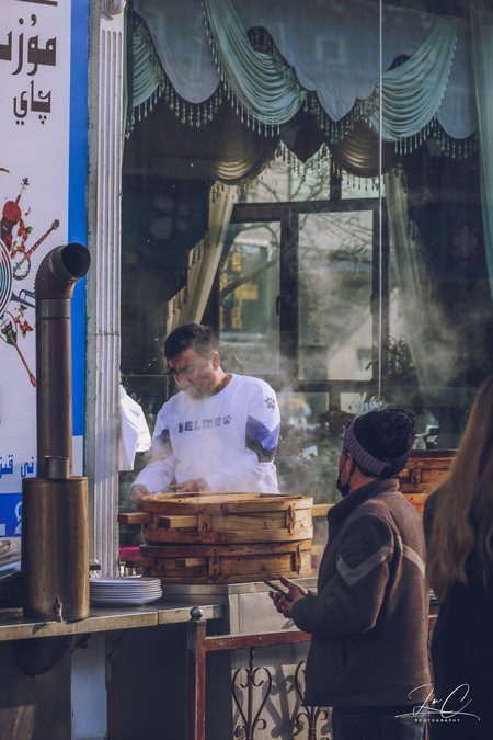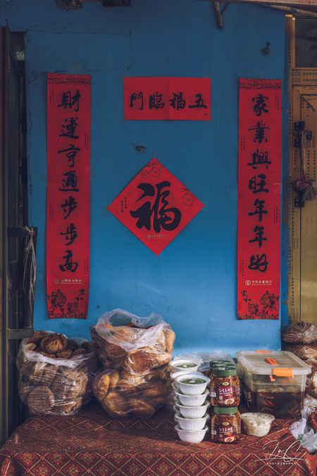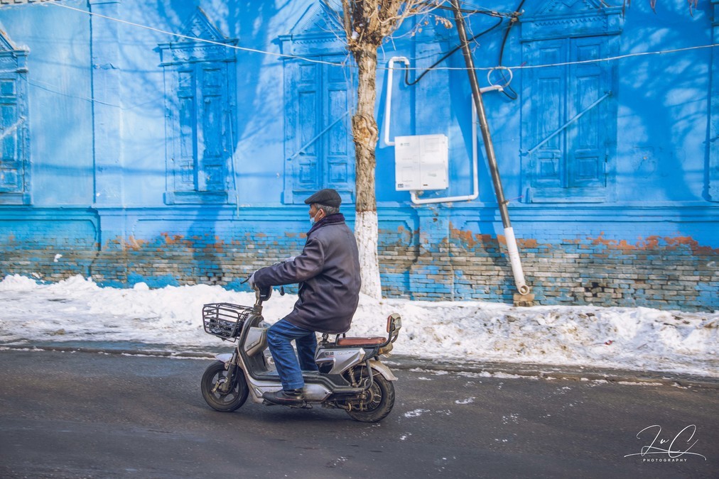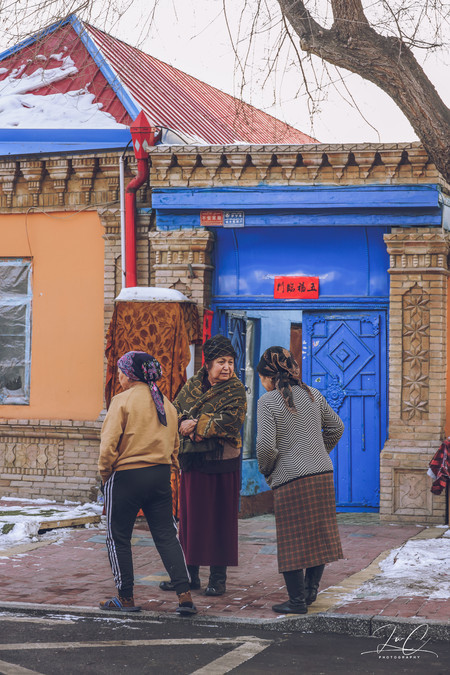 Kazanqi is a great place for capturing human scenes. There are local people buying meat and vegetables on the street, neighbors gathering together to chat in the alleys, children running and playing happily in front of the gate, elderly people slowly cycling through the streets... And there are the baked naans placed in front of the store, several times larger than my face, the mutton hanging from the eaves, and the Han-Uyghur bilingual couplets pasted in front of the blue gate... At a glance, it is filled with the aroma of daily life, so vivid and lively. I like this place.