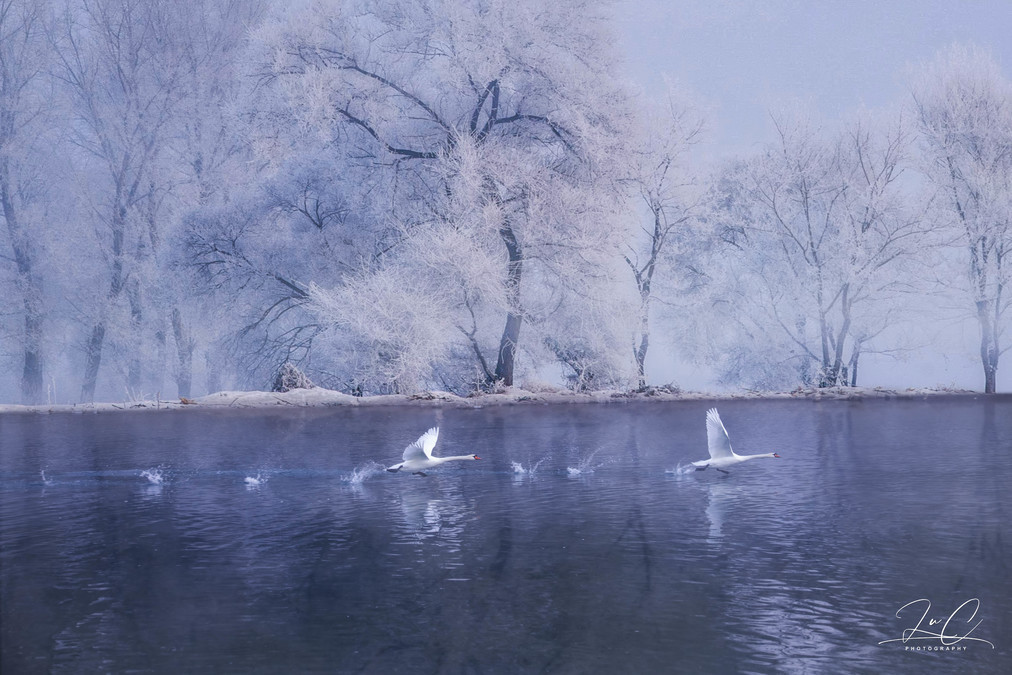 There are many swans here. Especially when they gather for feeding, it really looks like a rural goose farm. But actually, it's best to just capture a couple of swans during the shooting. The more, the more chaotic the scene becomes. The simple scene of a single swan dotting among the frost flowers is already very beautiful.